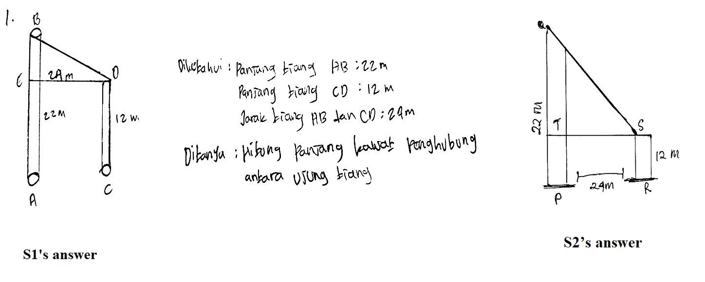 In this stage, the students showed certain reactions through a specific activity, observing information repeatedly to thoughtfully decide further steps to take and make them at ease in understanding the problem well. Reacting to the given situation could be shown by repeatedly reading the question. It was followed by designing a raw sketch based on the students' understanding, as shown in Figure 1. S1 and S2 sketched the plane as precisely as possible, setting up the size precisely and putting different symbols in both poles. The difference shown by S2 was reflected from the two parallel lines that denoted the distance of the poles.