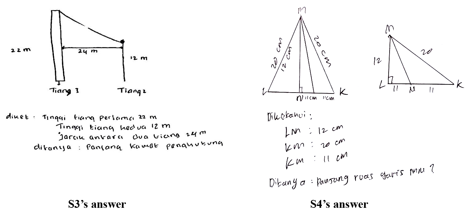 In this stage, the students exhibited a connection between necessary information in the figure by proposing some problem-solving steps. However, they did not really use their prior knowledge to point up their diverse understanding of the illustrative figures they created. Since the wire that connected the pole was the problem, S3 assumed that the wire was the hypotenuse. Afterward, the student recalled prior experiences in solving a similar problem, which led the subject to use the Pythagoras theorem to arrive at the answer.