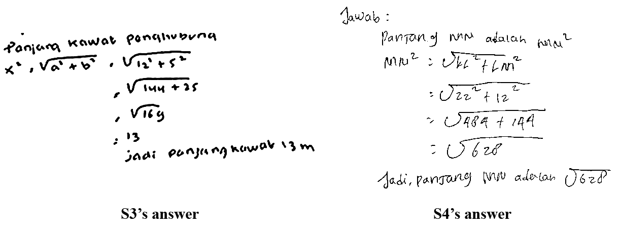 Akin to S3, S4 also attempted to formulate some possible alternatives to find the length of the line through the following connection "NL=MK-LM,KN=KN-NL, and MN=MK+KN." In this phase, the subject was aware that a fallacy occurred, especially in the application of the mathematical model. After contemplating, the subject proposed another alternative which was related to the concept of Pythagoras. In this stage, both of the students considered the solution they proposed based on their basic understanding as follows.
