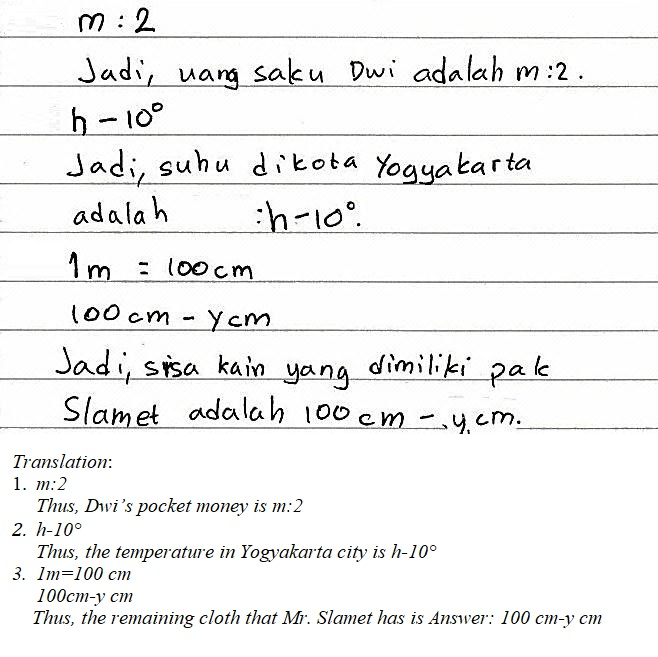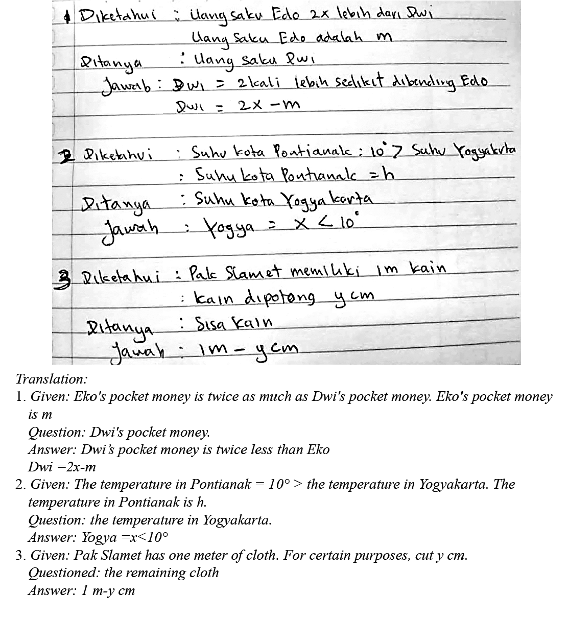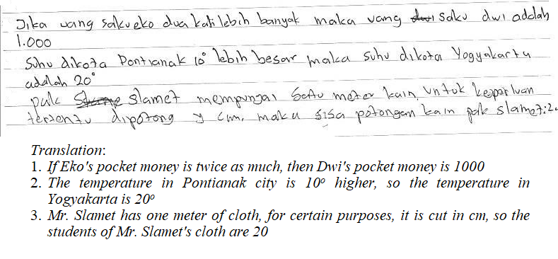 On the other hand, 31% of the students had wrong answers, but there are efforts to use symbols (Figure 2). In problem 1, the FSE-US students understand that Eko's pocket money is twice as much as Dwi's pocket money but cannot write down Dwi's pocket money and ultimately gets the wrong answer. Similarly, in Problem 2, the temperature in Pontianak 10° is greater than the temperature in Yogyakarta City, but they could not write down the temperature of Yogyakarta city. This shows that students understand the given situation. In contrast to these two problems, problem 3 does not require reverse thinking skills.