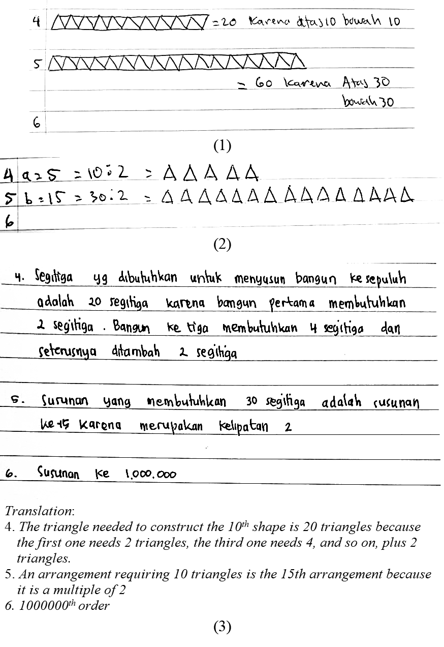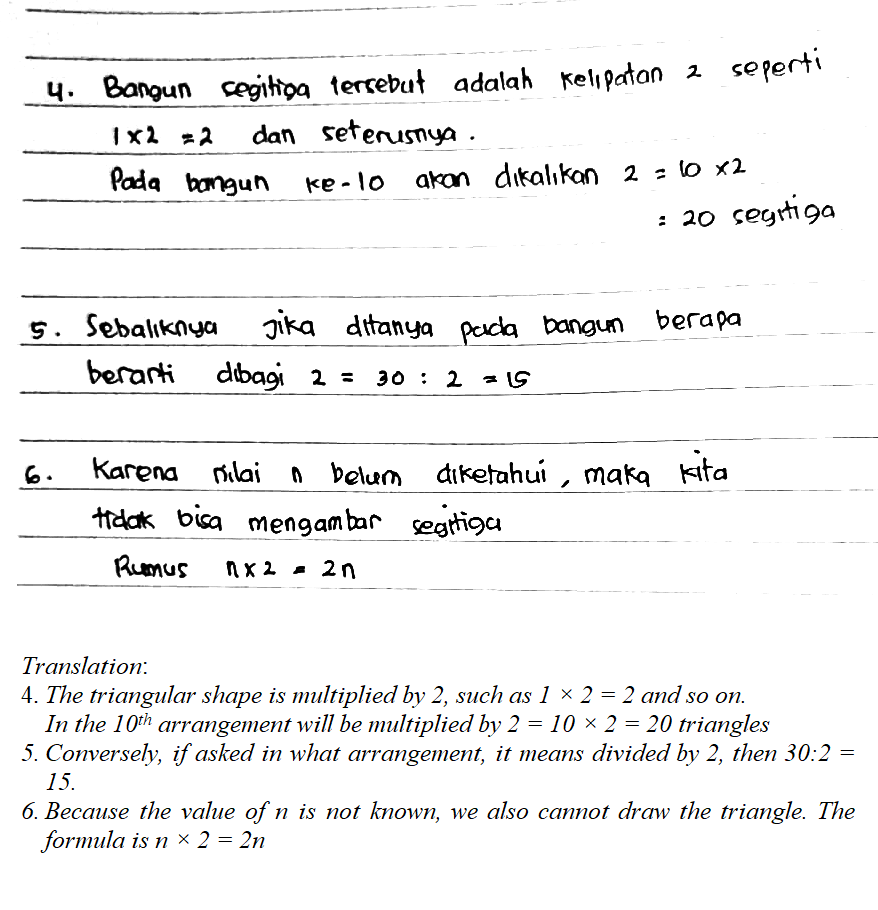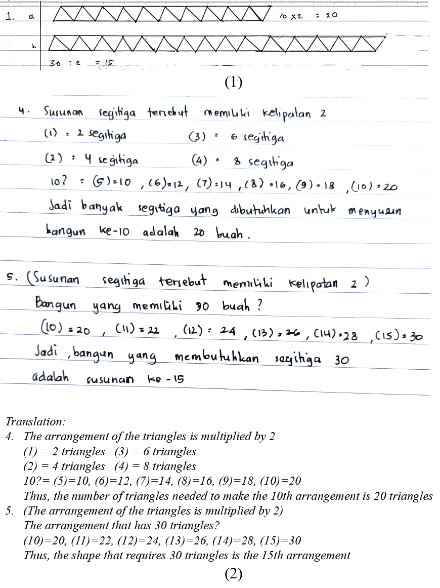 Students misunderstood the given patterns. The number of triangles in each shape forms a pattern multiplied by 2. However, in Figure 6 (1), students answer that the pattern in questions no. 4 and 5 are the same, namely multiplied by 2, and in Figure 6 (2), some students answer that the number of triangles forms a pattern divided by 2 form number 4 and 5. Thus, students can answer correctly for number 4 but incorrectly on number 5, or vice versa, because students do not read the questions given well. Most students think that what numbers 4 and 5 are asking is the same thing. In addition, students answer the questions given by using alphanumeric symbols and the recursive type, which uses the previous term to find a certain term. It is shown in the following interview results.