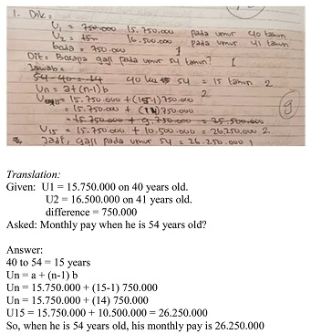 S1 found a solution to the problem by comprehending the known and requested information, namely the nth term of Pak Hadid’s age when he was 54 years old. We assumed that the student was “visualizing” the solution because the procedure took a considerable amount of time. After a period of silence, the student appeared to be fumbling with her answer sheets, occasionally rewriting and erasing her answers. It took over ten minutes for her to continue to start calculating Mr. Hadid’s income. By calculating the difference between 40 and 54, which represented Mr. Hadid’s ages, the student was able to predict the nth term when Mr. Hadid is 54 years old. S1 concluded that the problem could be solved using the arithmetic sequence formula. The nth term formula was derived through the problem-analysis process. The student initially did not anticipate using the formula, but after visualizing the problem, she was able to engage her mental devices. Visuals may consist of a description of events that students have had in the past (McFarland et al., 2017)