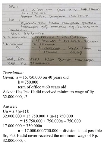 | S1an34-003 | J | First, I will determine the n from Pak Hadid’s age, which is 54 years old. After that, I will use the arithmetic series formula to find out Pak Hadid’s salary, because what was asked was the salary when Pak Hadid is 54 years old. So, I started counting n from the age of 40. |