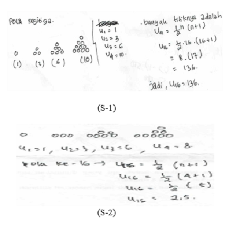 Referring to the students' answer in Figure 1 and the interview, we found that S-1 was able to correctly determine the number of dots in the 16th term. The pattern of the triangular numbers described and Un formula for the 16th term was correct. In contrast, S-2 did not correctly solve the problem. She made a mistake in determining the term of triangular numbers from term 1 to 4 and in writing Un formula to determine the 16th term. In addition, S-2 misrepresented the triangular number pattern.